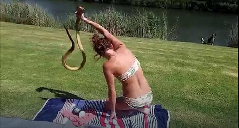 Ona na snimku hvata kobru ispod glave, a onda je, kao da je mrtva, odbacuje od sebe.