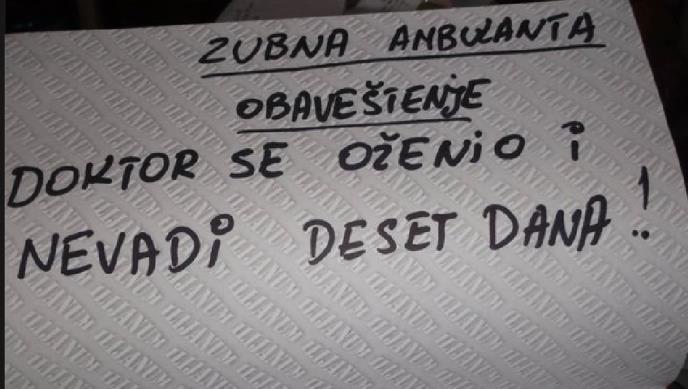 "Zubna ambulanta; obaveštenje: Doktor se oženio i ne vadi deset dana", napisno je, ali, sudeći prema komentarima ispod fotografije, nije jasno baš svima šta tačno ne vadi - zube ili...