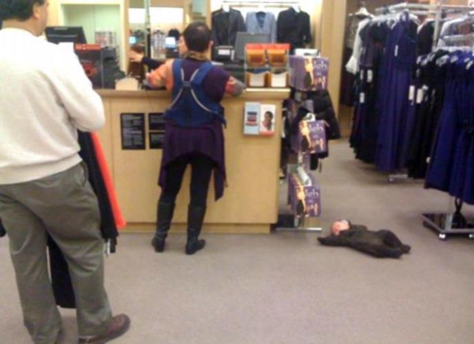 Zašto biste nosili bebu u nosiljci ili u kolicima kada jednostavno može da spava i na podu? Ne znamo šta je ovom čoveku bilo u glavi kada je stavio bebu na pod da spava u sred radnje, ali bar je dobro obučen pa mu nije hladno.