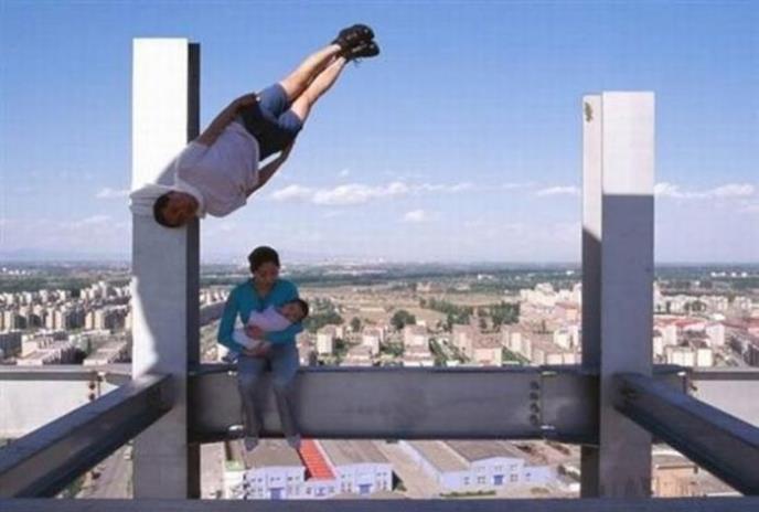 Ova fotografija nas ostavlja sa mnogo pitanja! Koliko su visoko? Zašto ona drži bebu? Šta ona uopšte traži tu? Oh da, i verovatno najveće pitanje, kako on to radi?
