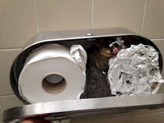 Ispostavilo se da je slatki mali oposum živeo u spremištu za toalet papir.