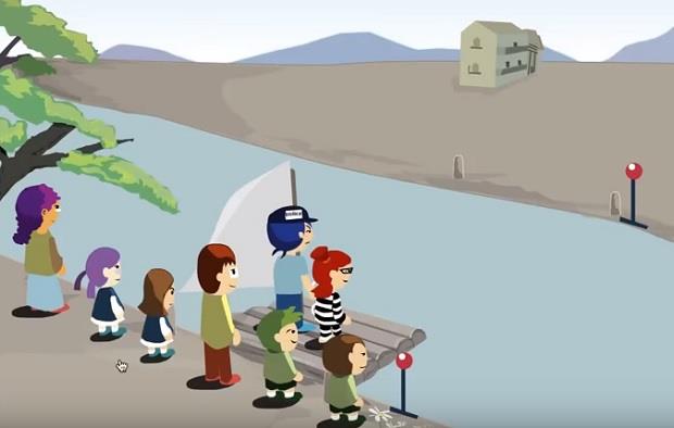 9. Da biste splavom prevezli 2 osobe na drugu obalu - kliknite na crvenu polugu.