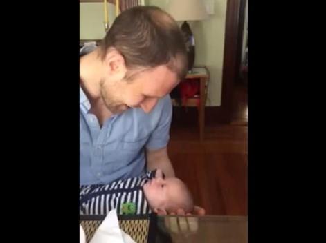 U ovom video snimku, otac se trudi najbolje ćšto može da natera bebu da se nasmeje. Pravi smešne grimase i zvuke, ali mu ne ide nikako.