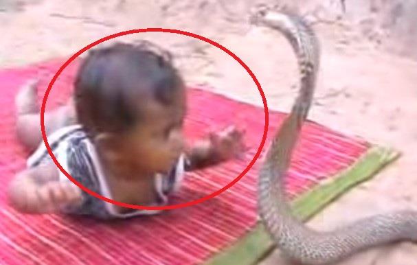 Jednogodišnja beba puzala je blizu kraljevske kobre koja je bila spremna da napadne plen. Čim je beba stigla do kobre, ona je napala bebinu glavu.
