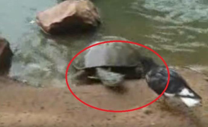 Zgrabila je najblićžeg goluba, zatim ga je držeći za vrat uvukla u duboku vodu gde možete da vidite kako leti perje. Ova kornjača napada kao aligator! Kakvo ludilo!
