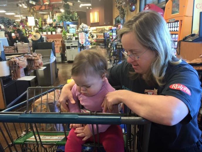 "Kada pravila ovu fotografiju, Karli je već bila uznemirena (prošlo je njeno vreme za spavanje i mleko), ali sam ipak uspela da ih slikam, jer kada se ovako nešto dogodi to su najlepši trenuci u životu. Ova žena radi u lokalnoj prodavnici, a ja uvek biram da budem u njenom redu na kasi. Čak i dok sam bila trudna, birala sam njen red, čak i kada je kod nje red bio duži. Dok sam bila trudna, pričala bih sa njom po nekoliko minuta. Morala sam. Želela sam da znam šta Daunov sindrom znači za moju ćerku i kako će biti kada poraste. Kakav će njen život biti? Da li će biti kao ova žena?