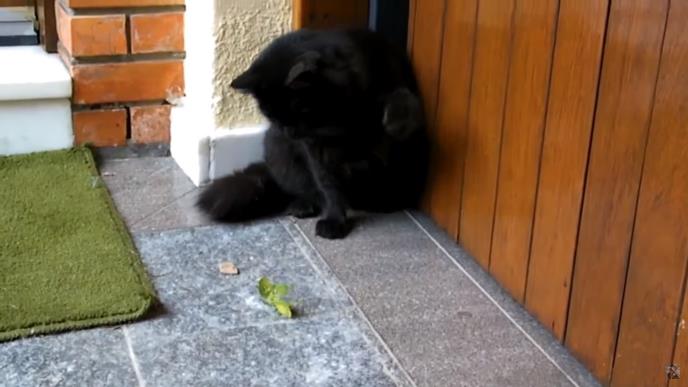Ispostavilo se da je crna mačka ipak sebi prešla put, pa je hrabrost bogomoljke prevladala.