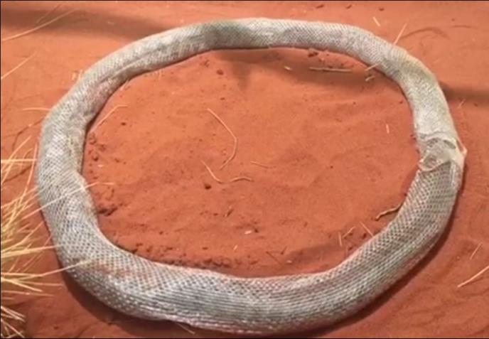 This deserves to go viral. Visitors to the Reptile Centre asked us about the snake shedding its skin and this is what was happening. It's a Stimson's Python and has managed to shed completely within itself with its tail finishing inside its 'sloughed mouth'! So the Stimmy now fully sloughed is just going round and round inside its sloughed skin! It actually looks like a steering wheel. Have been in the reptile business a long time and have never seen anything quite like it. Have seen similar but nothing as perfect as this. By the way he has now busted through!