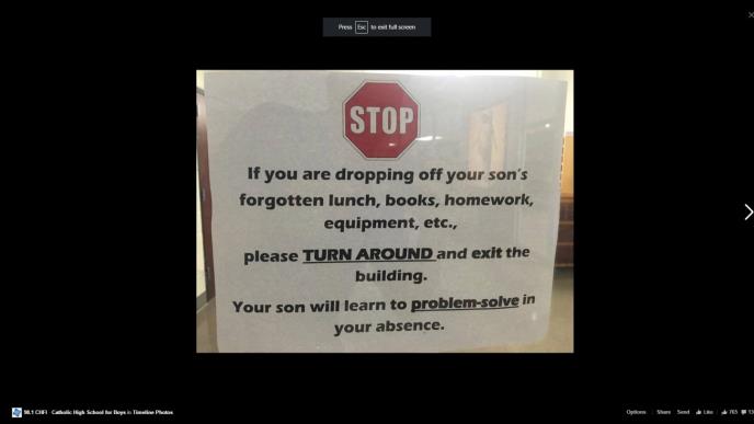 Ako ste došli kako bi svom sinu doneli ručak, knjige, domaći zadatak, opremu ili nešto slično što je zaboravio, molimo vas da se okrenete i napustite zgradu. Vaš sin će na taj način naučiti da rešava sopstvene probleme bez vaše pomoći"