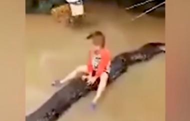 Trogodišnji dečak Truong, koji s porodicom živi u vijetnamskoj provinciji Tan Hoa nije mogao da sakrije uzbuđenje kada su roditelji, koji drže ogromnog pitona kao kućnog ljubimca, iskoristili priliku da puste zmiju da se "igra" u vodi do članaka, koja je poplavila njihovo dvorište na opštini Ha Long, u okrugu Ha Trung.