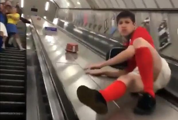 On je, kao da je na toboganu, počeo da se spušta niz platformu koja razdvaja dvoje pokretnih stepenica. Međutim, vrlo brzo je svoj "ponos" nabio na izbočinu koja miu se našla na putu. Sa bolnom grimasom nastavio je da se spušta, ali je na novoj prepreci udario zadnjicu i odleteo naglavačke na stepenice.