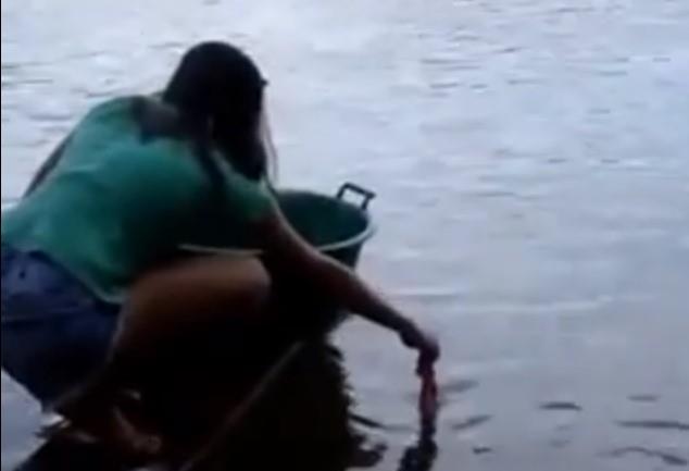 Jedna devojka uz pomoć parčeta sirovog mesa hvata mase pirana, a ono što plaši jeste zvuk njihovih vilica.