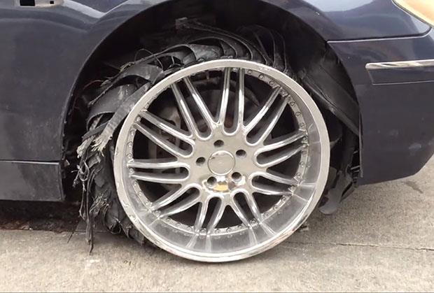 Beli zarezi na sivoj podlozi vode nas do novog parkiranog BMW-a kojeg je neko, ko nema blage veze o vožnji automobila, bezdušno vozio sa izbušenim gumama. Toliko je bio uporan u tome da je gume razgradio na froncle i nastavio da vozi na felnama. To je, opet, povuklo nova oštećenja na automobilu, pa sad ne liči ni na šta.