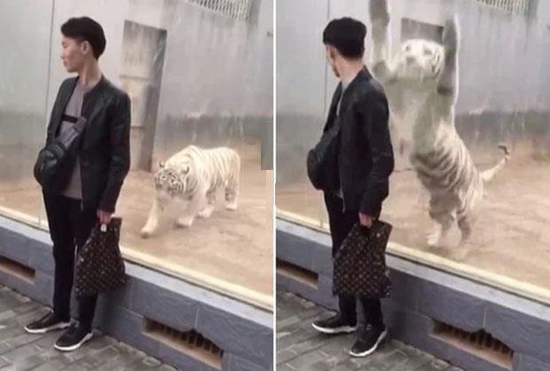 Takav je slučaj i sa belim tigrom iz ovog klipa koji je snimljen kako se prikrada momku koji stoji uz stakleni zid koji ih razdvaja. On je, očigledno, znao za sklonost ove životinje da se baca na one koji mu stoje kraj kaveza, pa je poslužio kao "žrtva" za dobar snimak.