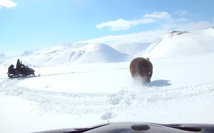 Grupa momaka koja se motornim sankama uputila ka jezeru Gluhiv spazila je u jednom momentu medveda koji tumara snežnim prostranstvom. Kako je bio relativno blizu njih odlučili su da ne propuste priliku da mu se "pridruže".