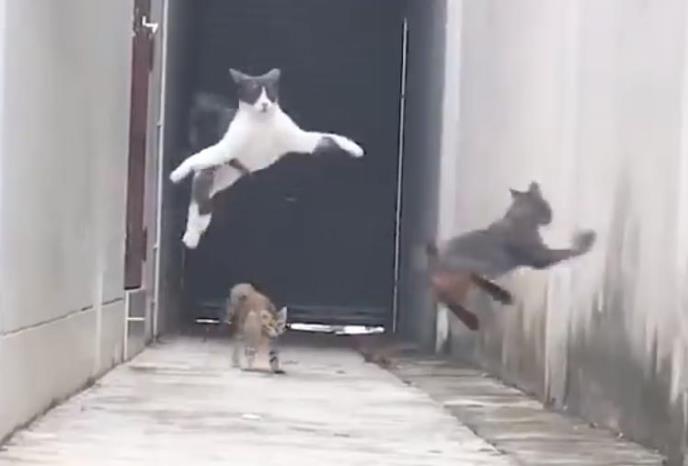 Ono što snimak čini smešnijim je što je u pitanju gurpa mačaka: