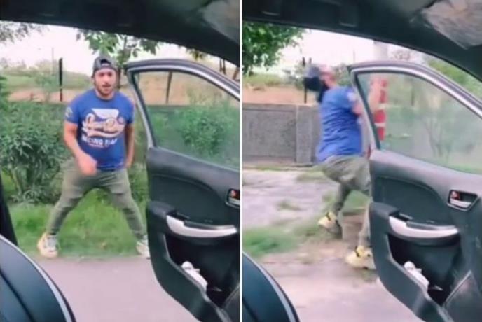 HTEO DA ISPADNE BAJA, SAD GA BOLI GLAVA! Đuskao pored auta u pokretu, ali zaboravio na važnu stvar! (VIDEO)