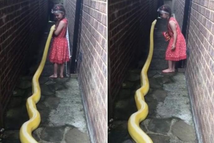 Tako se ženka burmanskog pitona po imenu Šer više puta podizala, ali nikada nisu uspevali da je snime. A onda se ponovo propela pokraj devojčice, ćerke vlasnika zmije. Pošto se klinka redovno druži sa gmizavcima, ona se nije uplašila, već se nagnula ka zmiji taman da je održi u tom neobičnom položaju i omogući roditeljima da je snime.