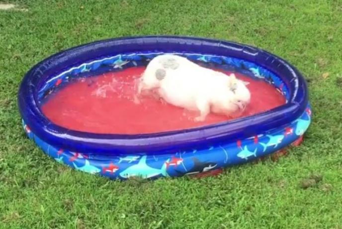 Kao i mnoge druge životinje i ovom prasencetu su teško pale letnje žege. Na sreću, dobilo je dečiji bazen ispunjen vodom, pa se oduševljeno počelo da se brčka.