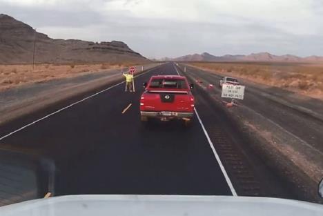 Kada su zbog radova na putu u nekoj američkoj divljini putari počeli naizmenično da propuštaju vozila, većina vozača se uredno zaustavila i čekala da se prolaz omogući i u njihovom smeru. Međutim, šofer ogromnog kamiona nije uspeo da zakoči na vreme, pa je prozujao pored svih i zakucao se u vozilo na čelu kolone.