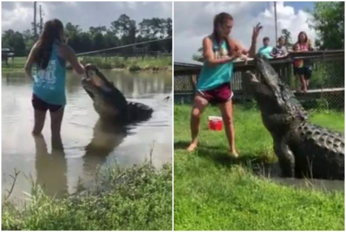 Mlada žena, koja je zaposlena u Gatorlendu na Floridi bez imalo straha hrani zverke. Na snimku se jasno vidi kako ona vabi aligatora, koji joj mirno prilazi, a zatim joj uzima iz ruke zalogaj po zalogaj.