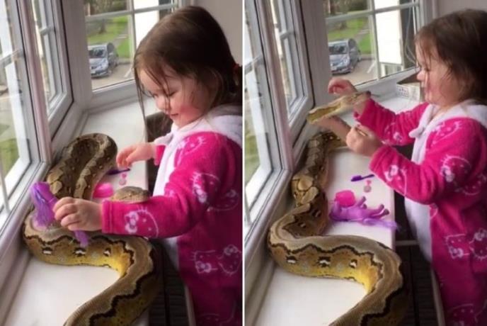 Tako se ova trogodišnja devojčica u isto vreme igra sa lutkama i pitonom. Po snimku bi se reklo da je zmija već navikla na ovakvo drugovanje i da i ona uživa u zajedničkoj igri.