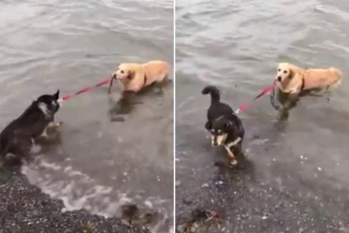 Zato je situacija, kada ih je vlasnik doveo do jezera, postala "povuci-potegni". Retriver je dohvatio uzicu sa ovčarem i počeo da ga vuče ka vodi. Ovaj se, opet, nije dao skvasiti, pa je upro u plićaku i ni makac dalje.