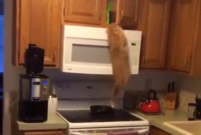 Najpre se popela na šporet, potom propela preko mikrotalasne, a na kraju visila na njoj dok je glavom izvlačila kesicu sa hranom.