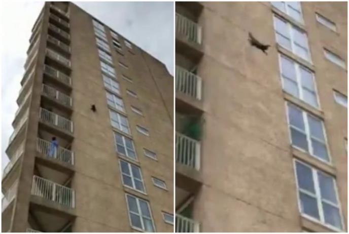 Životinjicu su primetili stanari i okupljeni prolaznici i strahovali šta će se dogoditi ako rakun padne sa te visine. I upravo to se desilo. Međutim, iako je tresnula, životinja je odmah skočila i odjurila kao da se ništa nije desilo.