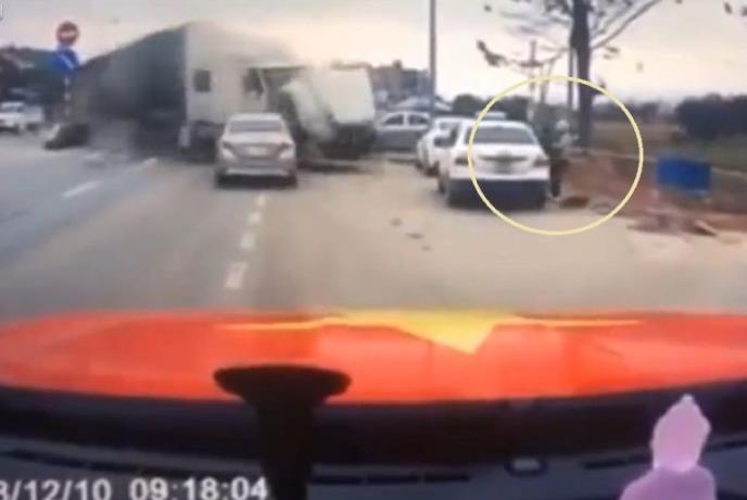 Snimak žestoke saobraćajne nesreće, u kojoj je ogromni kamion izleteo iz svoje trake, probio zaštitnu ogradu, preleteo u suprotnu traku i izleteo sa puta, prestravio je sve koji su ga videli. Posebno zbog toga što je nekontrolisana grdosija poletela ka automobilu pored kojeg je stajala žena sa detetom u naručju.