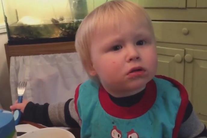 Ista takva situacija se dogodila ovom mališi koji zapitkuje sve oko sebe "gde mi je viljuška?". Iako mu zdušno pomažu i govore da je pored njega, malac nikako ne uspeva da ukapira da mu je u ruci.