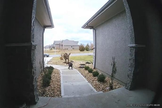 Međutim, scena koju je zabeležila nadzorna kamera ispred jednog doma u Kanzasu, podsetila nas je na tu igru. Samo što učesnici igre nisu deca, već - srndać i pas.
