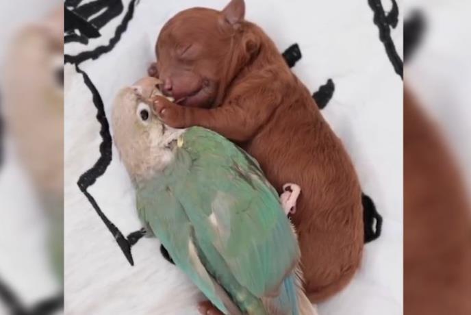 Jedan takav primer zabeležen je na snimku gde se maleno kuče pribilo uz papagaja i slatko drema. Sa druge strane, vidi se da i ptičici prija zagrljaj, pa se i ona ne odvaja od psa.