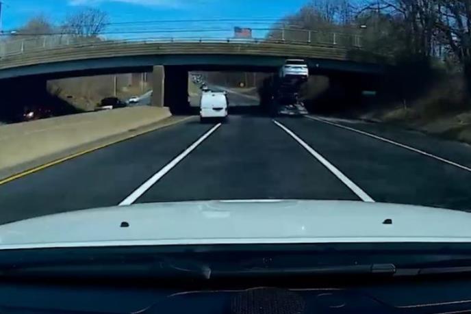 Izgleda da Amerikanac koji je vozio kamion natovaren automobilima nije uzeo u obzir koliko je visok teret koji prevozi, kao i da će na putu nailaziti na pasarele.