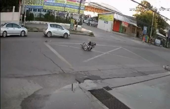 Na snimku se prvo vidi kako joj motocikl proklizava na vlažnom kolovozu i da devojka pada. Nekako se oporavila od te nezgode i ustala u nameri da nastavi dalje svoj put. Ali, avaj, čim je krenula da preseče prometnu trasu, jedan automobil je naleteo na nju i ponovo je oborio na zemlju. Na njenu sreću, nije se ozbiljnije povredila.