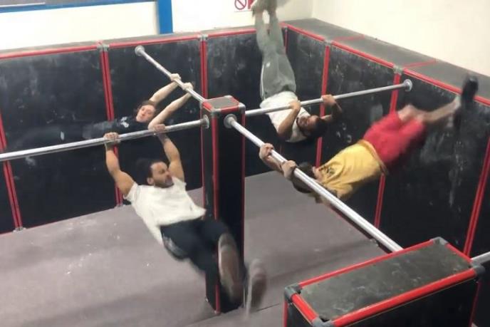 Na početku je svako od njih uhvatio za jednu šipku i zanjihao. Potom su istom momentu skočili na sledeću koja im se nalazila sa leve strane, pa ponovili isto još dvaput, bez ikakve greške.