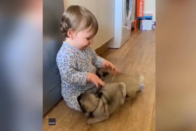 Razne životinje u obliku lutaka imala je ova beba, ali sada su joj doneli prave, žive kučiće. Kuce su joj odmah potrčale u naručje, pa je i ona zacičala od radosti.