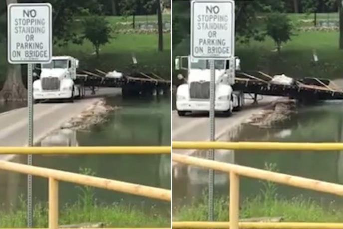 Lagano je pošao, a točkovi prikolice skliznuli su u vodu. Ni tada nije odustao. Nastavio je primerenim tempom, a zadnji deo vozila počeo je da se naginje. Ni toga nije omelo, već je i dalje terao po svome. Iako su očevici već počeli da vrište i mole se bogu, ispostavilo se da je vozač znao šta radi. Prikolica se polako ispravila i došla u ravan, pa je kamion normalno prešao most.