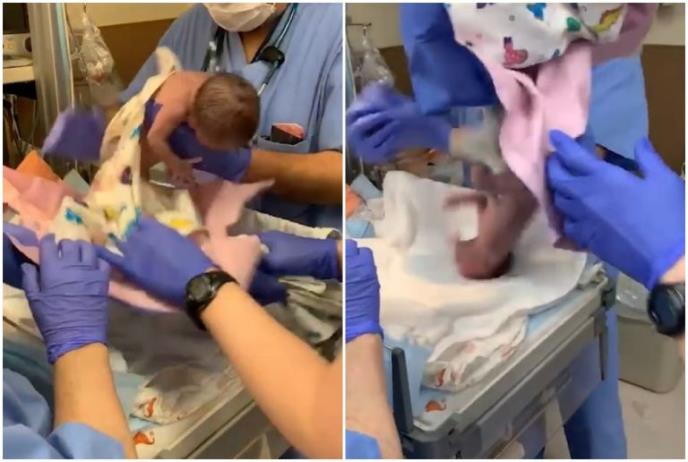 Na videu, koji je Derik snimao posle porođaja, a sada objavio na društvenim mrežama, vidi se trenutak kada dete ispada iz ruku jednom od njih i pada na pult, a samo zahvaljujućim brzim refleksima sprečava da padne na pod.