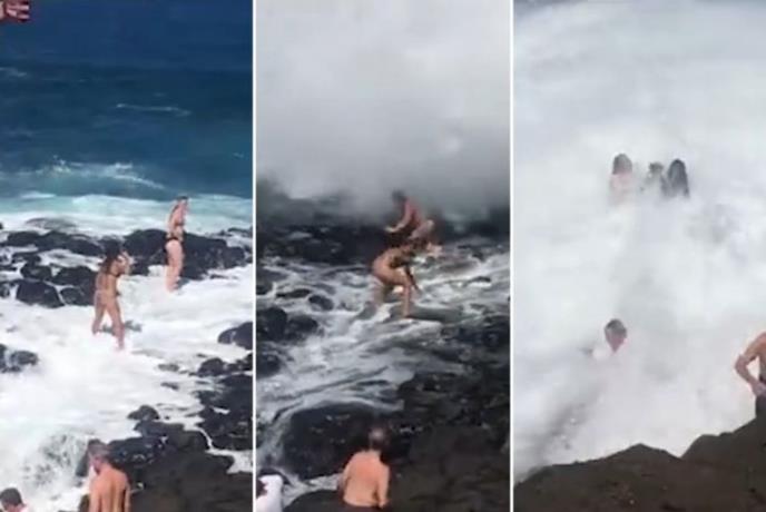 No, turisti k'o turisti, ignorišu sve apele i stalno dolaze da ovekoveče svoj boravak ovde. Tako su se i dve devojke popele na stene i prišle tik do okeana kako bi napravile što bolje slike. Čak ni kada ih je prvi talas pomeo u fotografisanju, one nisu odustale jer su htele još jednom da škljocnu. Tada se, međutim, pojavio jedan džinovski koji ih je oborio kao od šale.