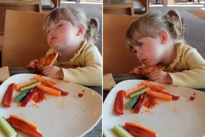 Ova devojčica, iako primetno umorna, nije odustajala od omiljene pice. Žvakala je i žvakala, ali joj je glava bila sve teža...