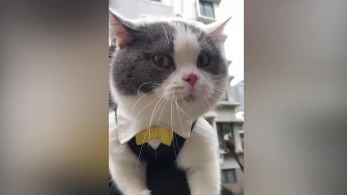 KAKVE ČUDNE ZVUKE ISPUŠTA OVAJ MAČAK! On kao da grdi i kritikuje nekog, možda se ljuti što su mu obukli odelce i vezali mašnu (VIDEO)