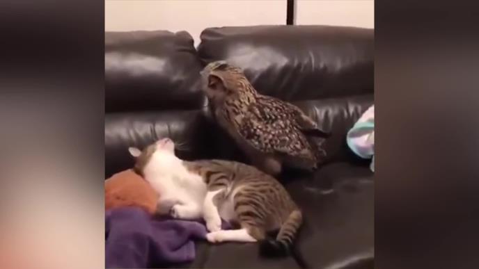 Snimak nam ipak potvrđuje da je sova ta koja dosađuje maci i ne dozvoljava joj da uživa u svom miru koji mačke vole više od svega.