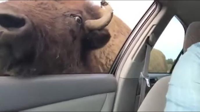 Žena je htela da iz kola nahrani bizona u jednom američkom rezervatu za životinje. Mislila je da to što je u kolima će biti dovoljno da mu da nešto hrane i da nastave dalje. Ali tako nije mislio bizon, kome se „hraniteljka“ očigledno dopala i želeo je „nešto više“. Džaba kola, džaba prozori. Evo kako je sve to izgledalo!