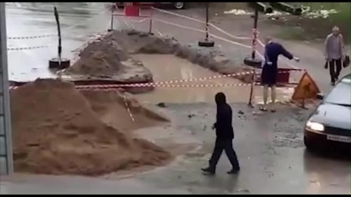 Znak upozorenja o radovima na putu, kao ni prljavština u vodi ga nisu sprečili u realizaciji ludog plana koji je zacrtao.
