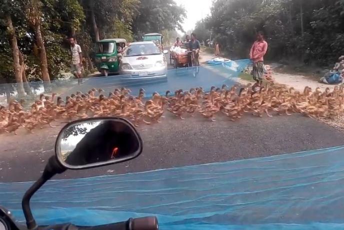 Negde ovce, negde krave, a u Bangladešu su patke okupirale kolovoz na povratku ka farmi. Vozači su, kao što propisi nalažu, dali prednost gegavim pešacima, ali se prelazak odužio jer je bilo na stotine ptica.