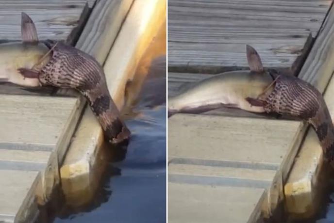 Ali, ovo nije bajka, već surova realnost. Ribu, koja se na nepoznat način našla na doku, vodena zmija je pokušala da proguta odjednom, pa da je onda negde na dnu svari natenane.