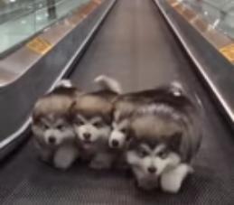 Četiri malena sibirska haskija se utrkivalo koji će pre da se uspenje uz pokretne stepenice, a ljudi ne mogu da se nagledaju slatkoće.