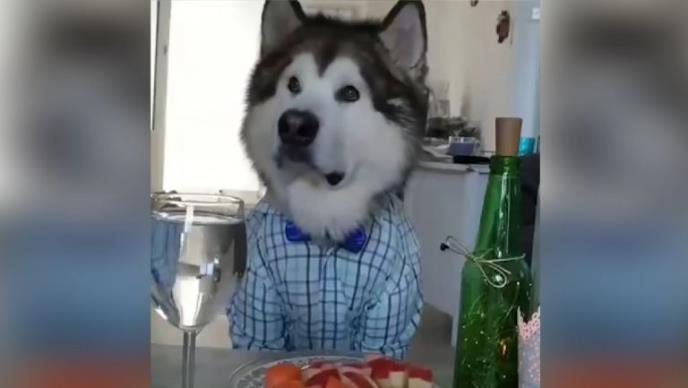 KAKAV DŽENTLMEN OD PSA! On nosi košulju, ima leptir mašnu, sedi za stolom i jede viljuškom (VIDEO)