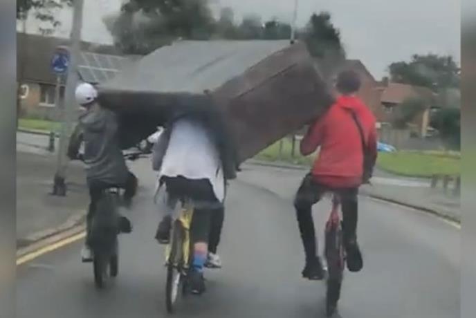 Ova četvorka iz Britanije stavila je kauč na svoje glave, leđa i ramena, sela na bicikle i sinhronizovanom vožnjom prevezla nameštaj na željenu lokaciju. Čist dokaz da je iznajmljivanje kompanija za selidbe čisto bacanje para...
